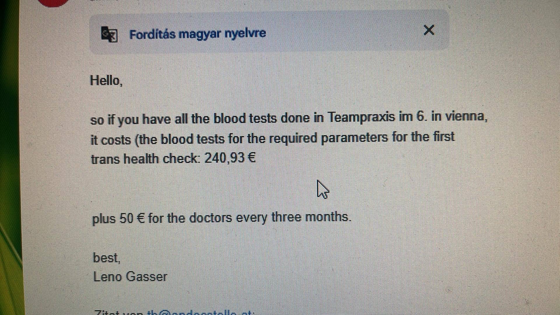 | 2025. november 12., 13:43 | Email-kert-vizsgalatok-teampraxis.jpg (fájl) | 58 KB | Efertone (vitalap | szerkesztései) | Egy lista a teljes vizsgálati elvárásokról és egy csökkentett, ha nem lehet a teljeset megoldani. Az emailben fontos elem: kiemeli, hogy ha latszik rajta nemzetközi kód (pl F64 amit itthon kiállítanak) akkor nem kell lefordítani a szakvéleményt. A képet Emily Sover küldte miután levelezett a klinikával, hogy extra információt szerezzen. | 1 | |